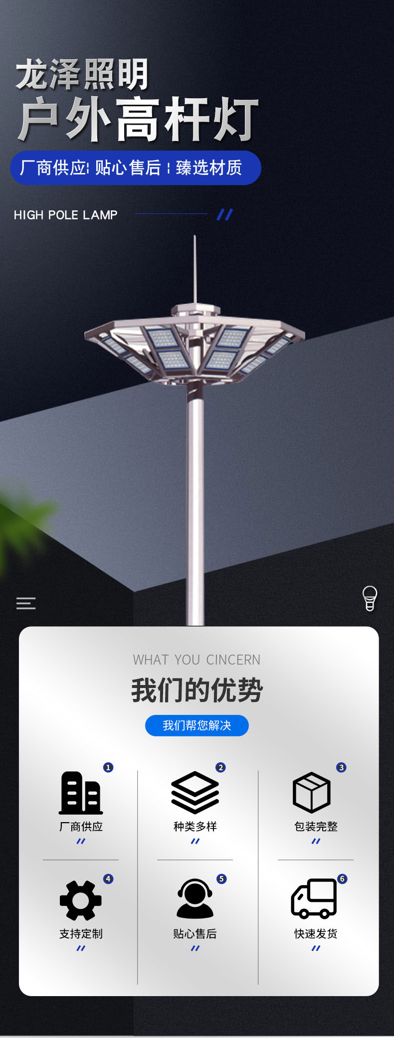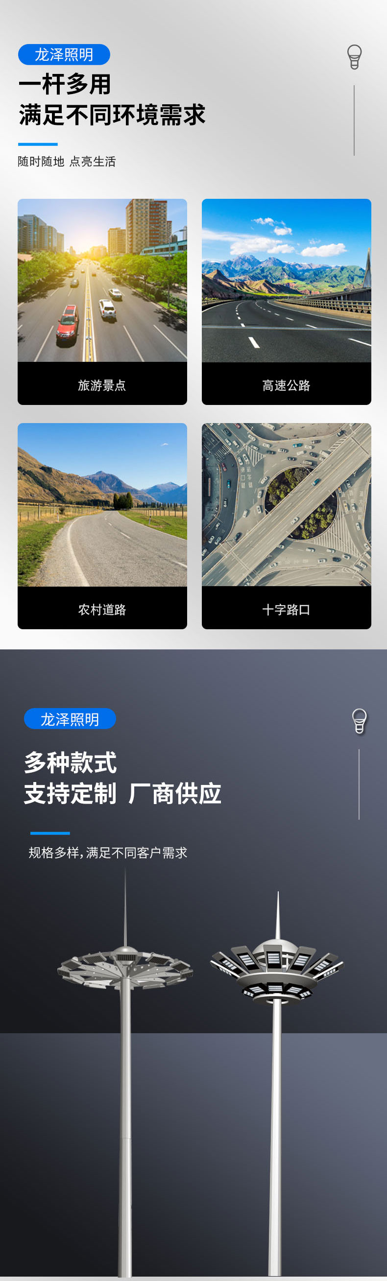 高桿燈照明是大面積照明最有效的一種照明方法它廣泛應用于港口、高速公路、城市廣場、多層互通式立交橋、體育館燈等室外大面積照明場所。